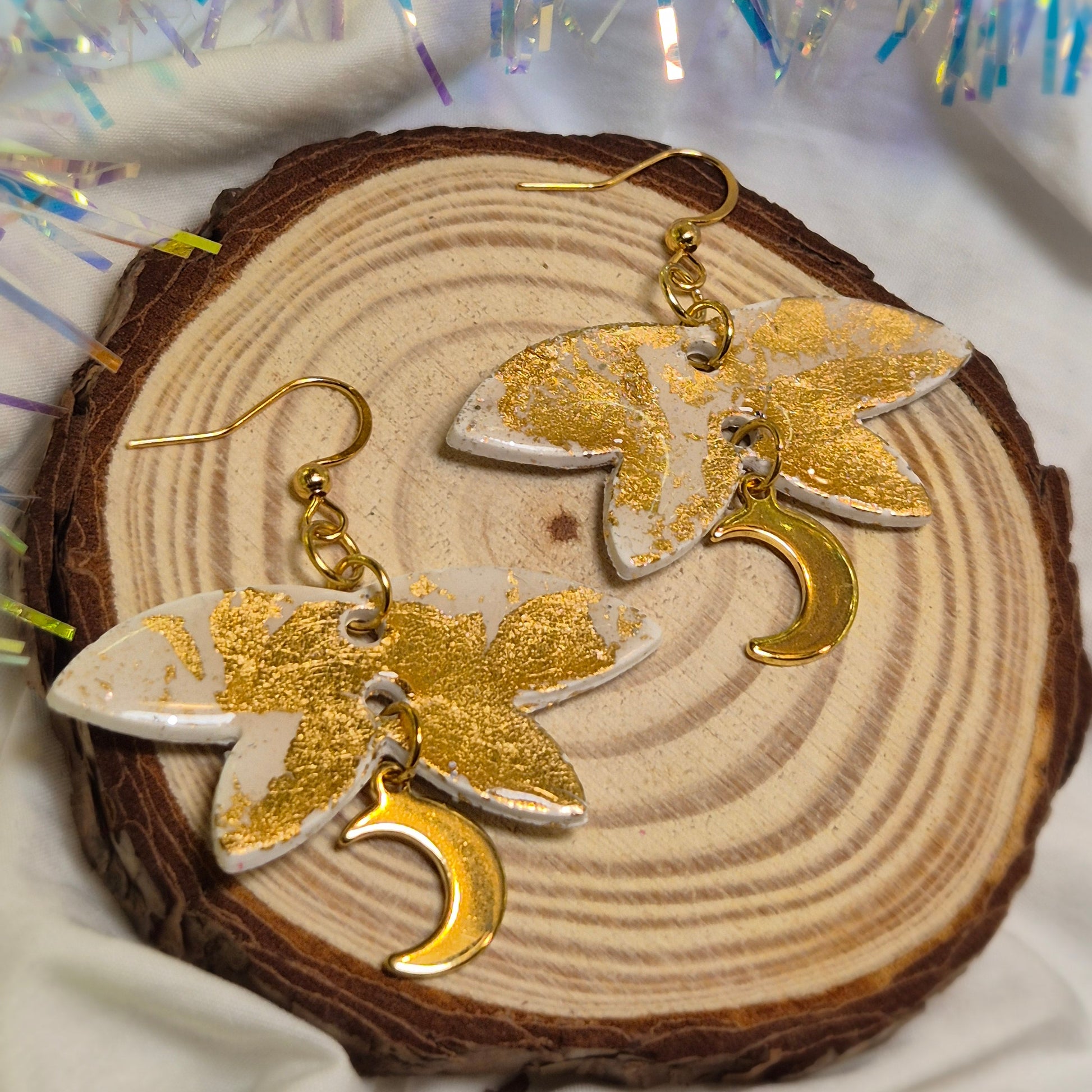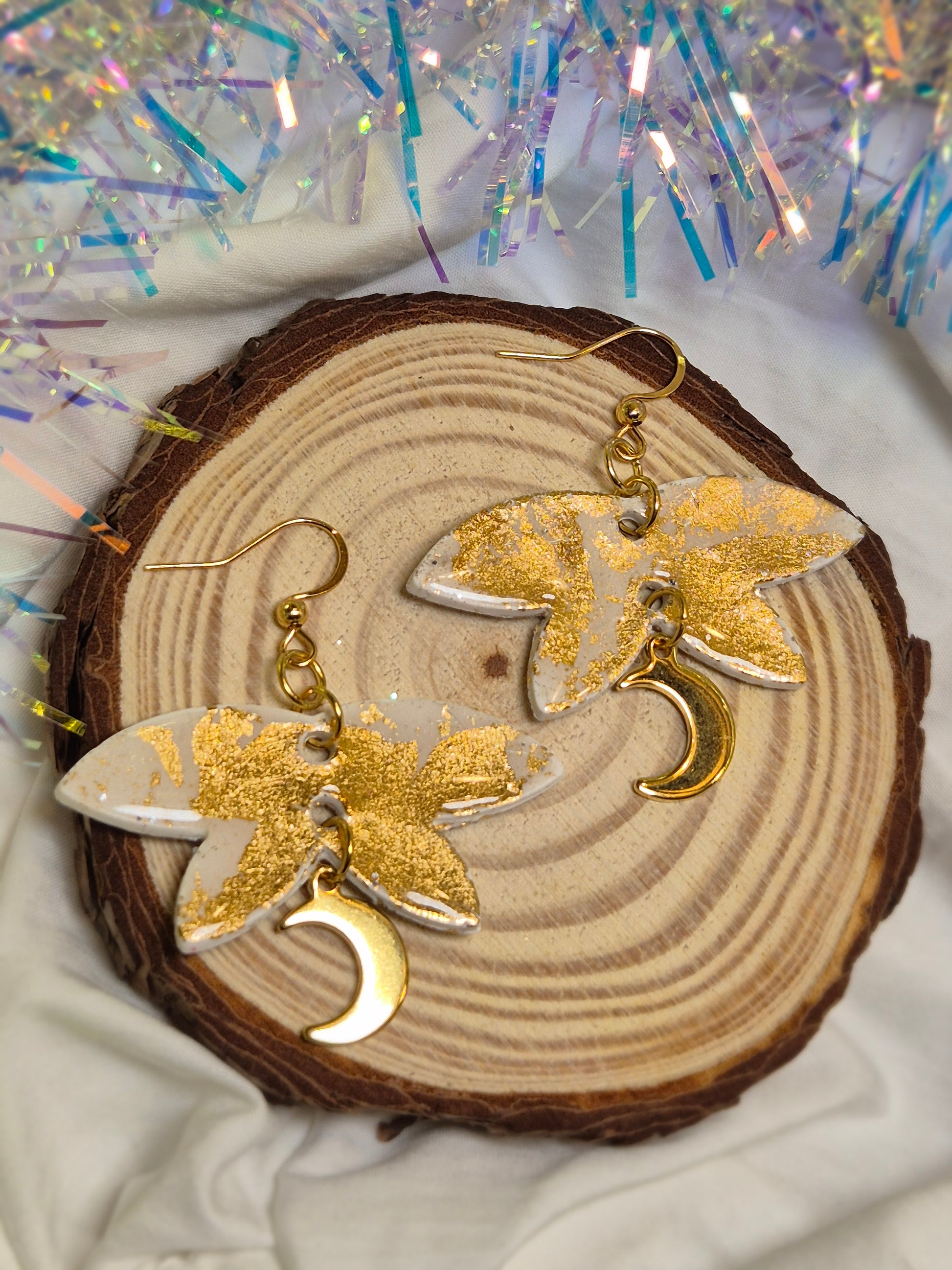 Boucles d’oreilles Blanche et Feuille d’Or - Breloque lune