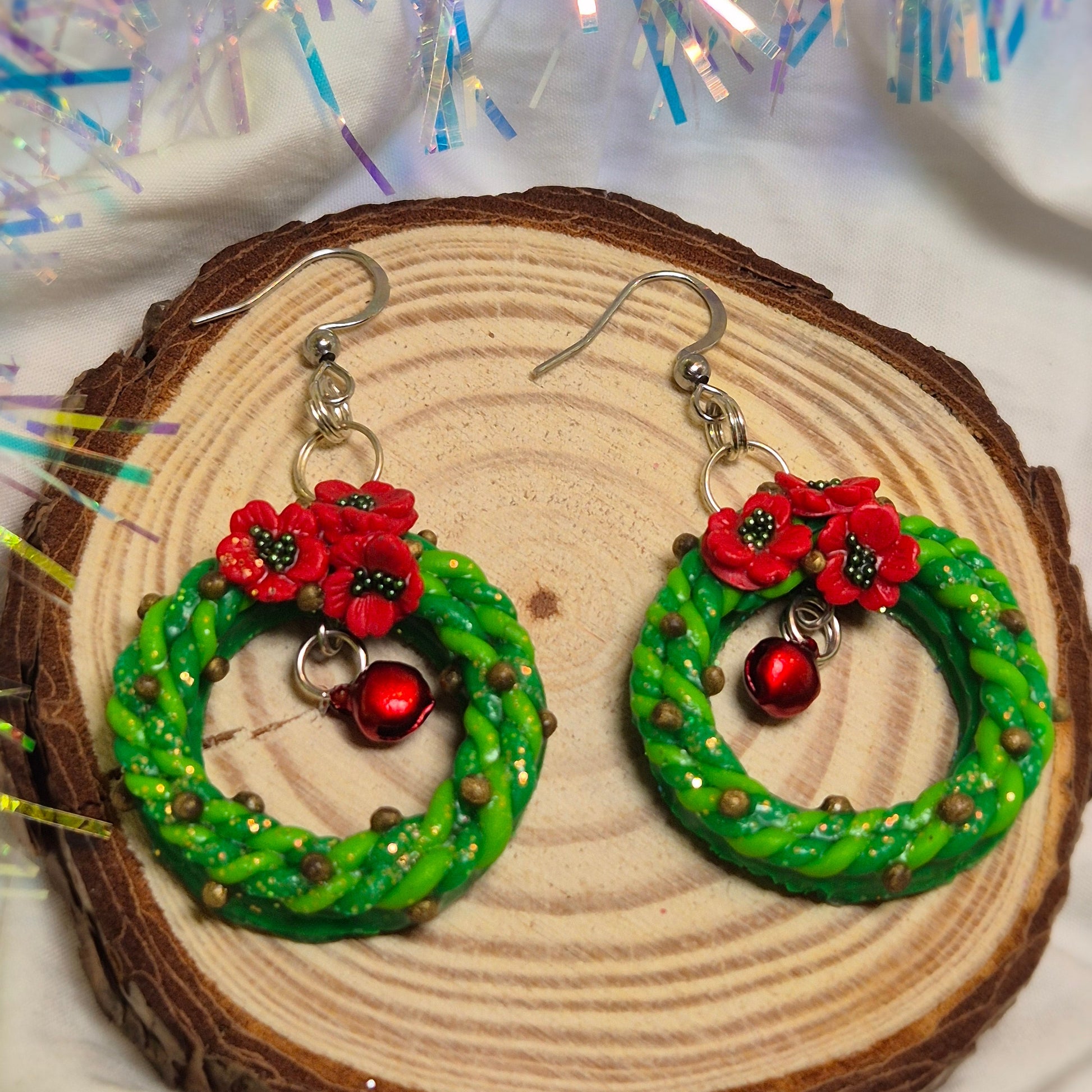 Ces boucles d’oreilles incarnent toute la tradition et la chaleur des fêtes de fin d’année. Chaque couronne est façonnée à la main en pâte polymère, avec minutie et passion. Trois petites fleurs rouges viennent orner la composition, évoquant les bougies et les décorations de l’Avent.