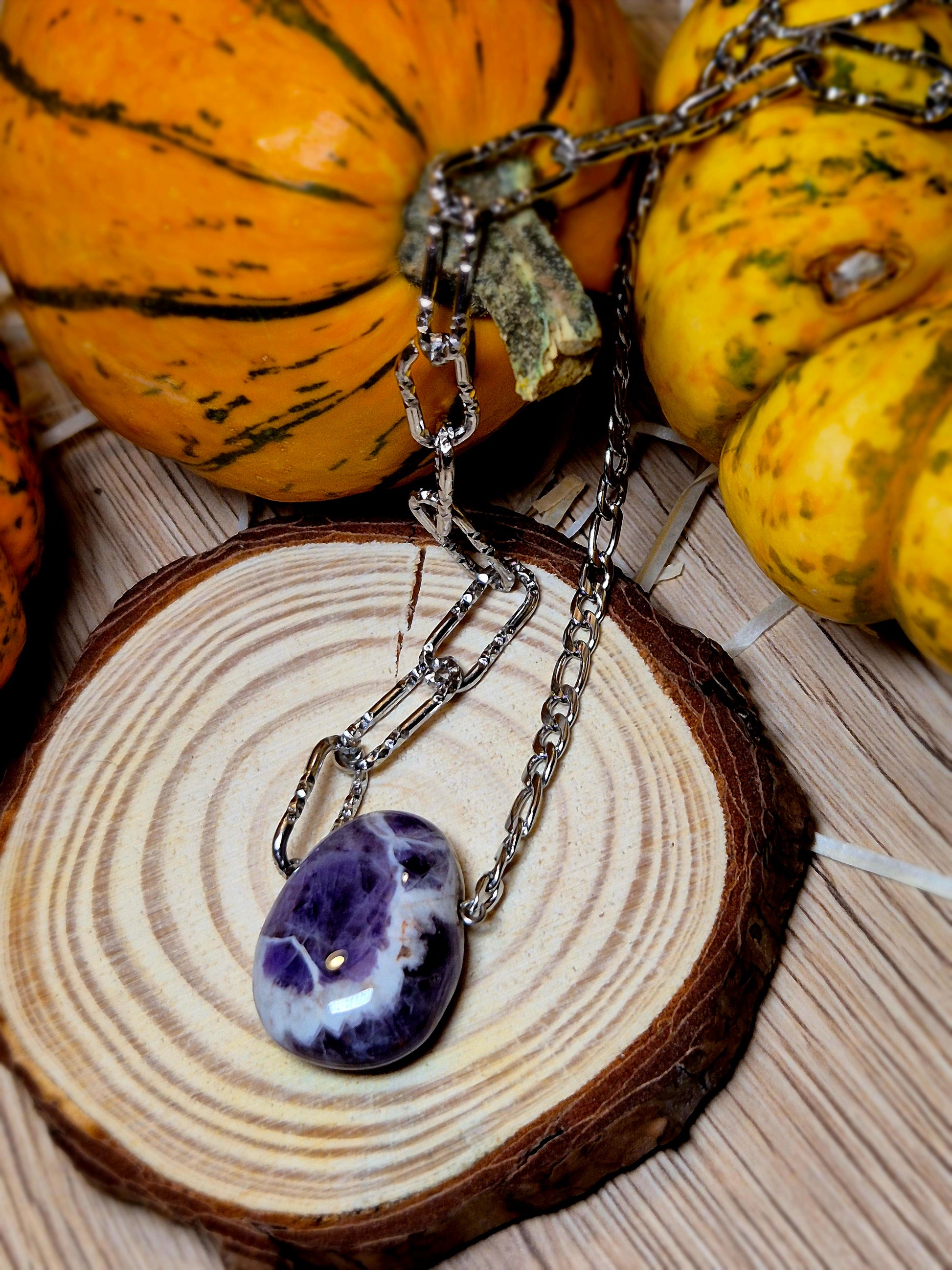 Ce collier audacieux mêle mystère et élégance. Réalisé autour d’une imposante pierre d'améthyste, il séduit par ses reflets profonds et changeants qui évoquent les nuits d’automne.